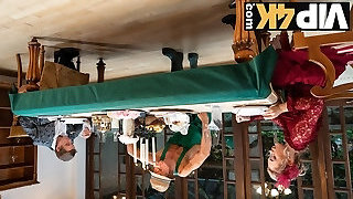 Nerdy blonde maid gets down on the table for the doggy style plumbing