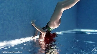 Gorgeous crimson haired mermaid Diana Rius shows underwater striptease