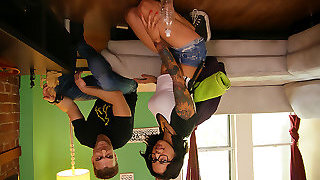 Strap-on Tattooed guy is pegged by his sexy brunette girlfriend