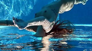 Busty and beautiful fresh redhead honey in the pool undresses underwater