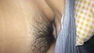 Katy fingers her pussy, getting her hairy pubic hair nice and wet.