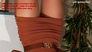 Kinky auburn gal in brief skirt luvs bragging of her rounded booty